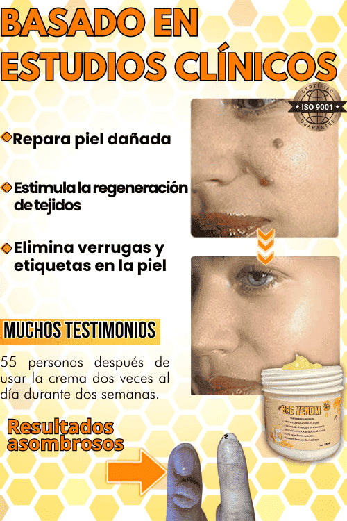 Esta asombrosa crema con base de veneno de abeja y miel tiene el poder de reducir manchas, estrías, cicatrices, queloides, verrugas y lunares de forma indolora y sin dejar cicatrices.